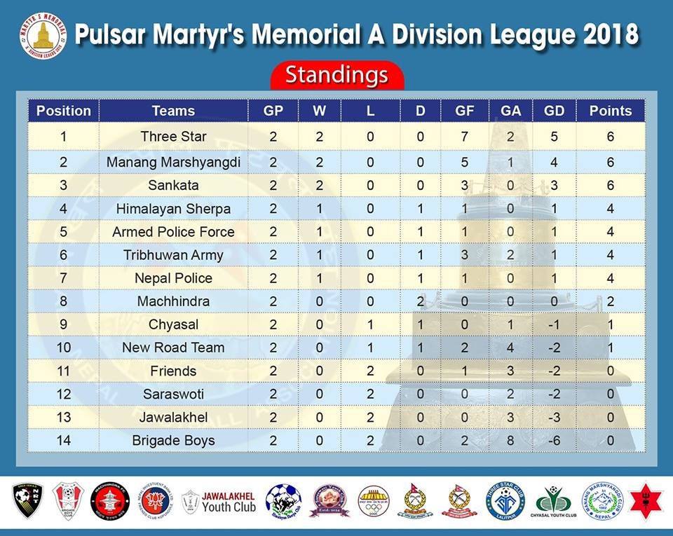 तीन विभागीय टिम नेपाल पुलिस, नेपाल आर्मी, एपिएफसंगै हिमालयन शेर्पाले ४ अंक जोड्न सफल भएका छन् । दुवै खेल बराबरी खेलेको मछिन्द्र आठौ स्थानमा छ । एनआरटी र च्यासल समान एक अंक जोड्दै क्रमश नवौ र दशौ स्थानमा छन् । प्रतियोगितामा सरस्वती, फ्रेन्ड्स, जावलाखेल र ब्रिगेड ब्वाईज अंक विहिन छन् ।