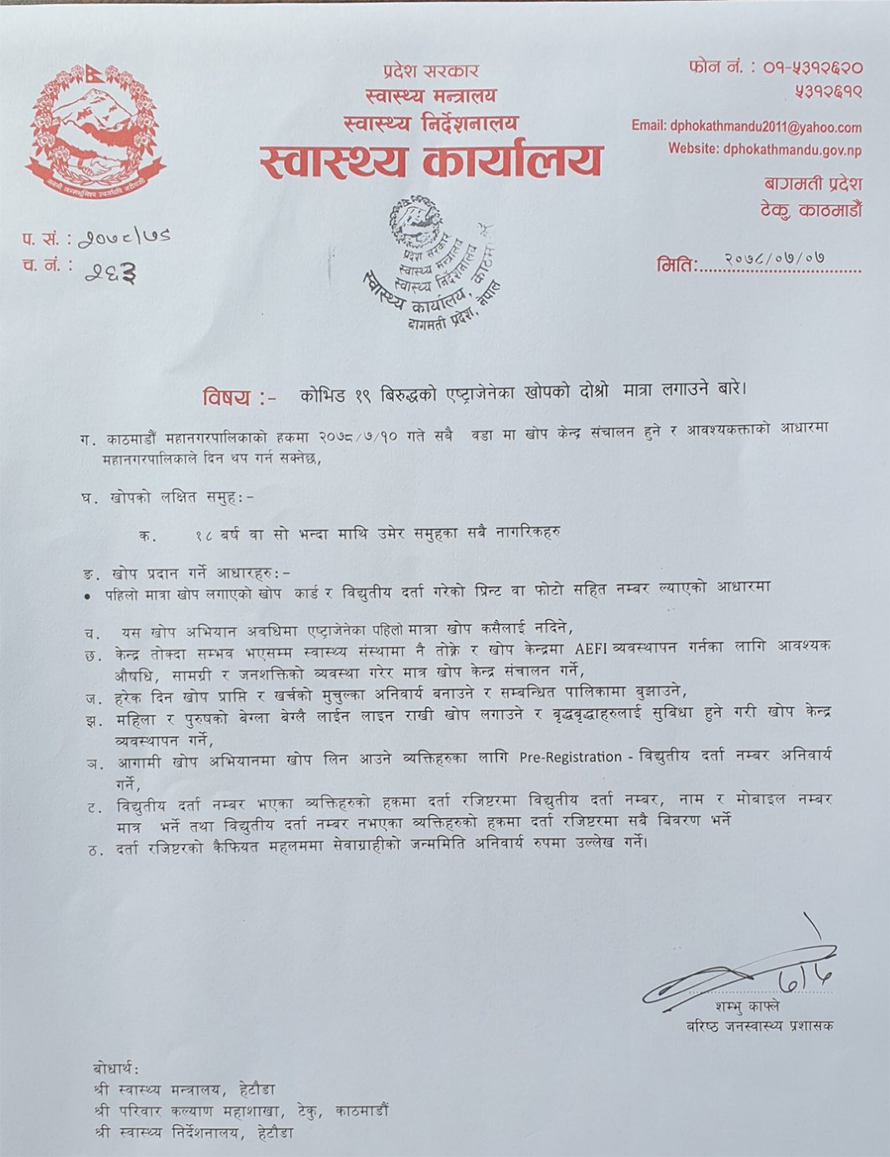 खोप लगाउन आउने व्यक्तिले पहिलो डोज खोप लगाएको खोप कार्ड र विद्युतीय दर्ता गरेको प्रिन्ट वा फोटोसहित आउन पनि स्वास्थ्य कार्यालयले अनुरोध गरेको छ ।