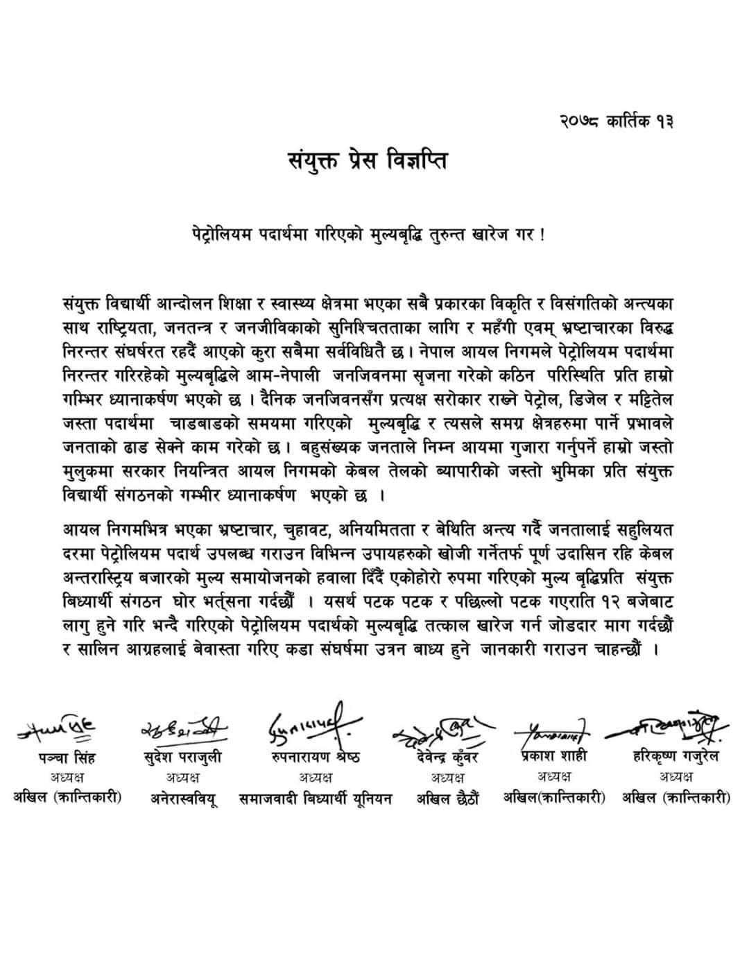 शनिबार माओवादी केन्द्र निकट अखिल (क्रान्तिकारी) अध्यक्ष पञ्चा सिंह, नेकपा (एकीकृत समाजवादी) निकट अनेरास्ववियु अध्यक्ष सुदेश पराजुली, समाजवादी विद्यार्थी यूनियनका अध्यक्ष रूपनारायण श्रेष्ठ, अखिल छैठौंका अध्यक्ष देवेन्द्र कुँवर र अखिल (क्रान्तिकारी) अध्यक्ष प्रकाश शाही र अखिल (क्रान्तिकारी) अध्यक्ष हरिकृष्ण गजुरेलले विज्ञप्ति जारी गर्दै मूल्यवृद्धि फिर्ता गर्न माग गरेका हुन् ।