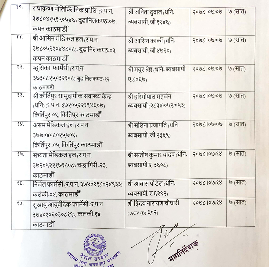 त्यसैगरी, राधाकृष्ण पोलिक्लिनिक प्रालि, आसिन मेडिकल हल, म्हसिका फार्मेसी, कीर्तिपुर सामुदायिक स्वास्थ्य केन्द्र, असम मेडिकल हल, सभ्यता मेडिकल हल, निर्जल फार्मेसी र सुखायु आयुर्वेदिक निलम्बनमा परेका छन् ।