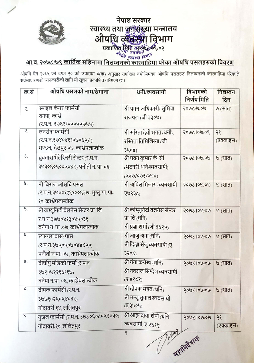 निलम्बनमा पर्नेमा स्माइल केयर फार्मेसी, जनसेवा फार्मेसी, धुव्रतारा भेटेरीनरी सेन्टर, विराज औषधि पसल, कम्युनिटी वेलनेस सेन्टर प्रा.लि, स्याउला वास.पस, दीर्घायु मेडिको फर्मा, दीपक फार्मेसी, युजल फार्मेसी छन् ।