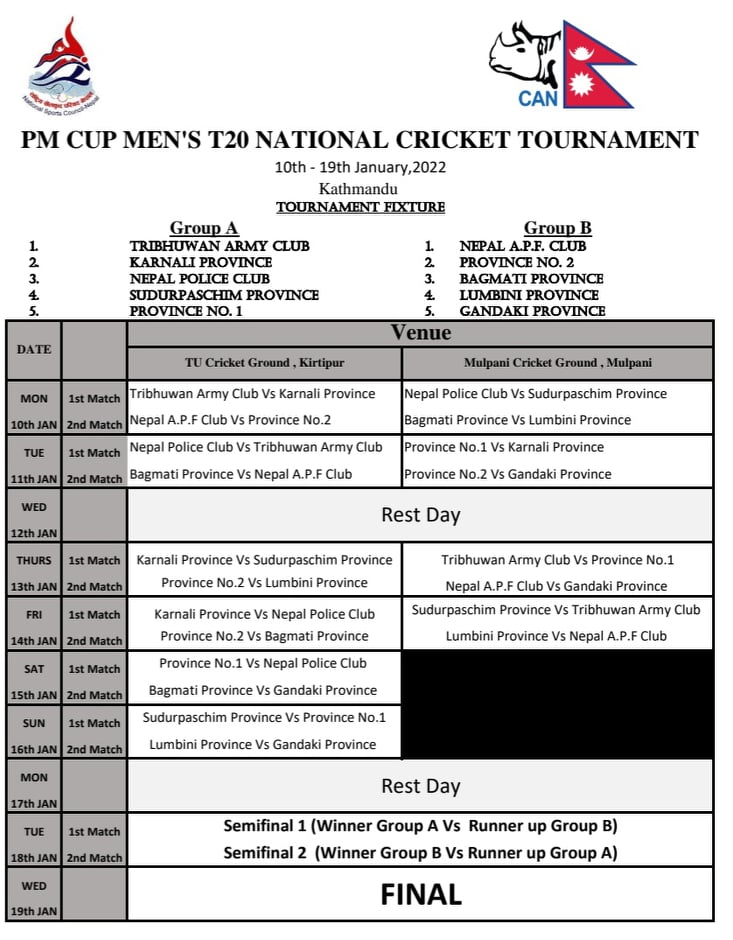 उद्घाटन खेल पुस २६ गते टियु क्रिकेट मैदानमा हुनेछ । टियुमा हुने दोस्रो खेलमा एपीएफ क्लब र प्रदेश २ बीच खेल हुनेछ ।