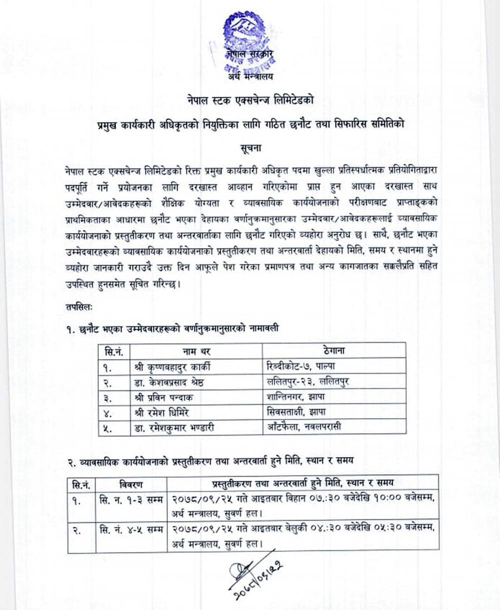 काठमाडौं । नेपाल स्टक एक्सचेन्ज (नेप्से)को प्रमुख कार्यकारी अधिकृत (सीईओ)का लागि पहिलो चरणमा ५ जना छानिएका छन् । यसअघि परेका आवेदनमध्ये उत्कृष्ट ५ जना छानिएको सिफारिस समितिले जनाएको छ ।