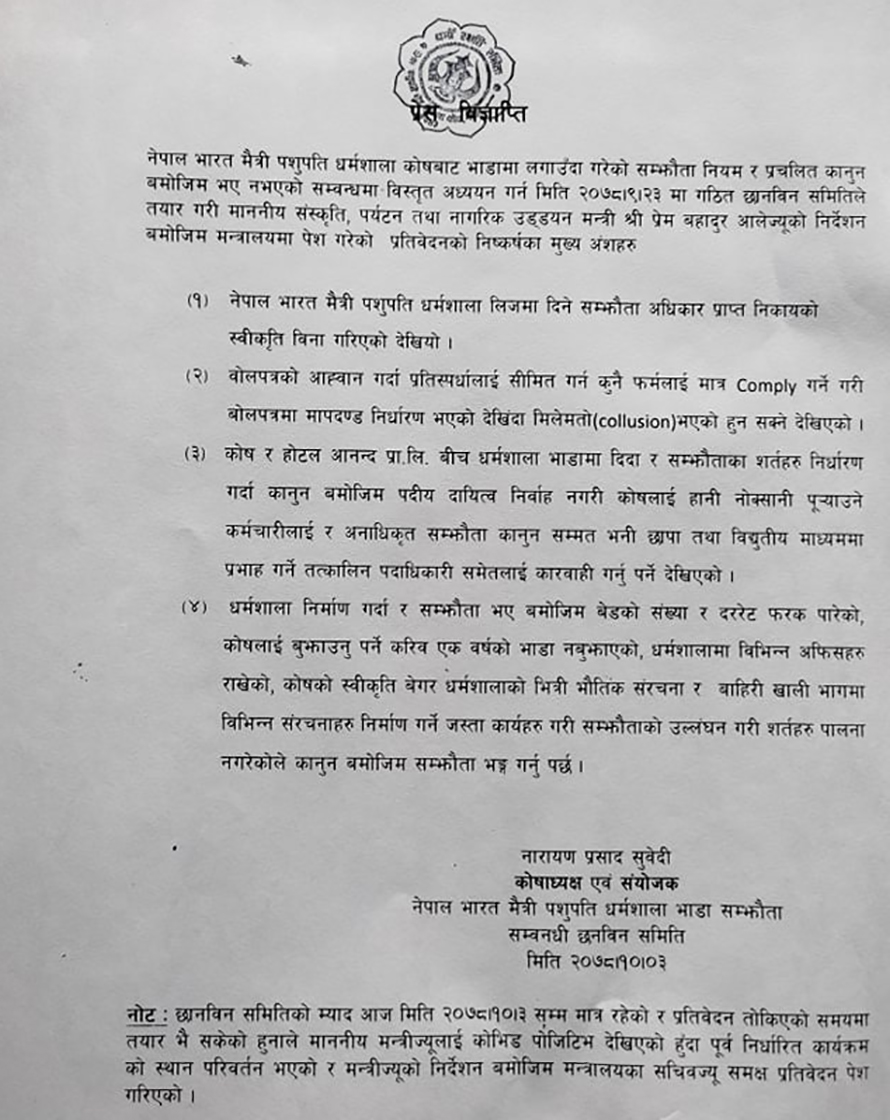 छानविन प्रतिवेदनले पनि अधिकार प्राप्त निकायको स्वीकृति विना सम्झौता गरेको, बताससँग मात्रै मिल्ने मापदण्ड बनाएर ठेक्का गरेकाले मिलेमतो भएको हुनसक्ने देखिएको, सम्झौता विपरीत बेड संख्या, दररेट राखेर धर्मशाला सञ्चालन गरिएको, स्वीकृतिविना संरचनाहरू थप गरिएको, धर्मशालाभित्र विभिन्न कार्यालयहरू राखेको, समयमै भाडा नबुझाएको लगायतका कारणा देखाएर सम्झौता रद्ध गर्न भनेको हो ।