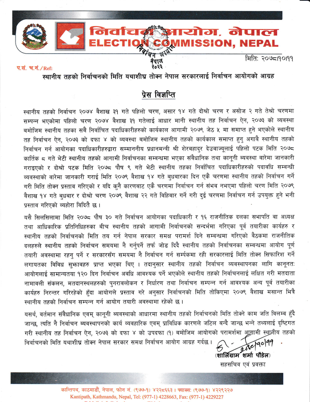 आयोगले ’२०७४ वैशाख ३१ गते पहिलो चरण, असार १४ गते दोस्रो चरण र असोज २ गते तेस्रो चरणमा सम्पन्न भएकोमा पहिलो चरण २०७४ वैशाख ३१ गतेलाई आधार मानी स्थानीय तह निर्वाचन ऐन, २०७३ को व्यवस्थाबमोजिम स्थानीय तहका सबै निर्वाचित पदाधिकारीहरुको कार्यकाल आगामी २०७९ जेठ ५ मा समाप्त हुने’ भन्दै म्याद सकिनु अगावै निर्वाचन सम्पन्न गर्नुपर्ने जनाएको छ ।