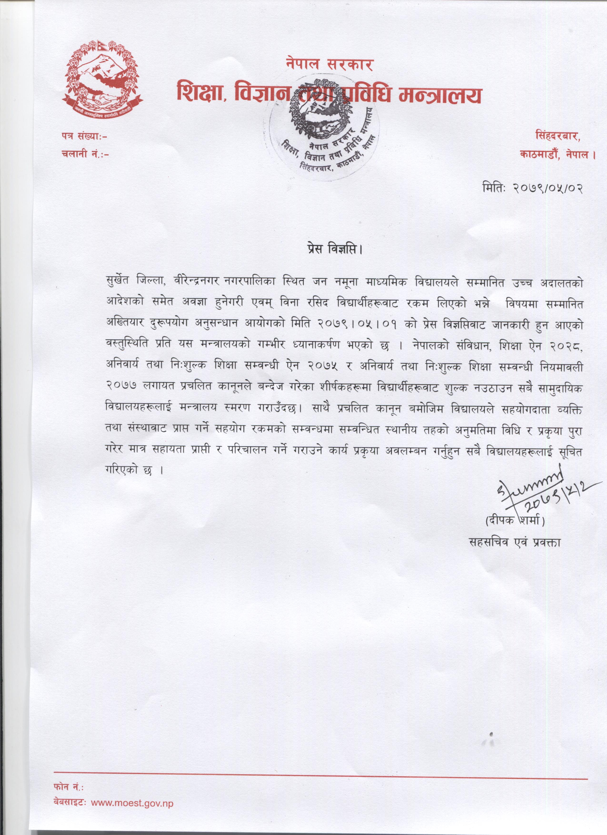 सहयोगदाताबाट प्राप्त सहयोग स्थानीय तहको अनुमतिमा विधि र प्रकृया पुरा गरेर मात्र लिन मन्त्रालयले ध्यानाकर्षण गराएको छ । मन्त्रालयका प्रवक्ता दीपक शर्माले कानुनले निःशुल्क गरेको विषयमा अनावश्यक बाहनामा शुल्क लिन नपाउने बताए । उक्त विद्यालयले कक्षा ११ को प्रवेश परीक्षामा उत्तीर्ण भएका विद्यार्थीहरूलाई भर्नाका लागि भन्दै अनावश्यक शुल्क लिएको थियो । बढी शुल्क लिइरहेको भन्दै अख्तियारमा उजुरी समेत परेको थियो । उजुरी परेपछि अख्तियारले छापा मार्दै विना रसिद विभिन्न विद्यार्थीबाट लिइएको २ लाख ७६ हजार ६९० रूपैयाँ नगद र सो सम्बन्धि कागजातहरू नियन्त्रणमा लिएको थियो ।