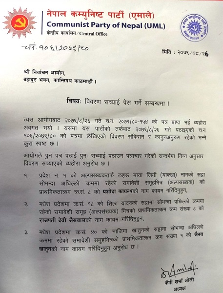 आयोगका अनुसार एमालेले प्रदेश नम्बर १ को प्रदेशसभा सदस्यका लागि समानुपातिकतर्फको बन्दसूचीमा अल्पसंख्यकतर्फ लहरुमाया जिमीको सट्टा अल्पसंख्यकको प्राथमिकताक्रम ८ का यशोदा कायस्थको नाम कायम गर्न पत्राचार गरेको छ ।