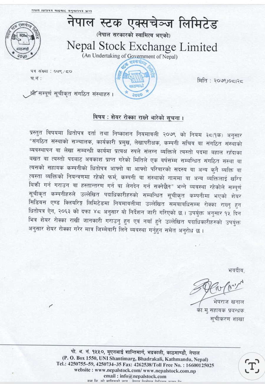 नेपाल स्टक एक्सचेन्जले बुधबार सबै सूचीकृत संगठित संस्थालाई पत्राचार गर्दै यस्तो जानकारी गराएको हो । नेपाल स्टक एक्सचेन्जका अनुसार धितोपत्र दर्ता तथा निष्कासन नियमावली २०७९ को नियम ३८ (१क) मा यस्तो प्रावधान रहेको छ ।