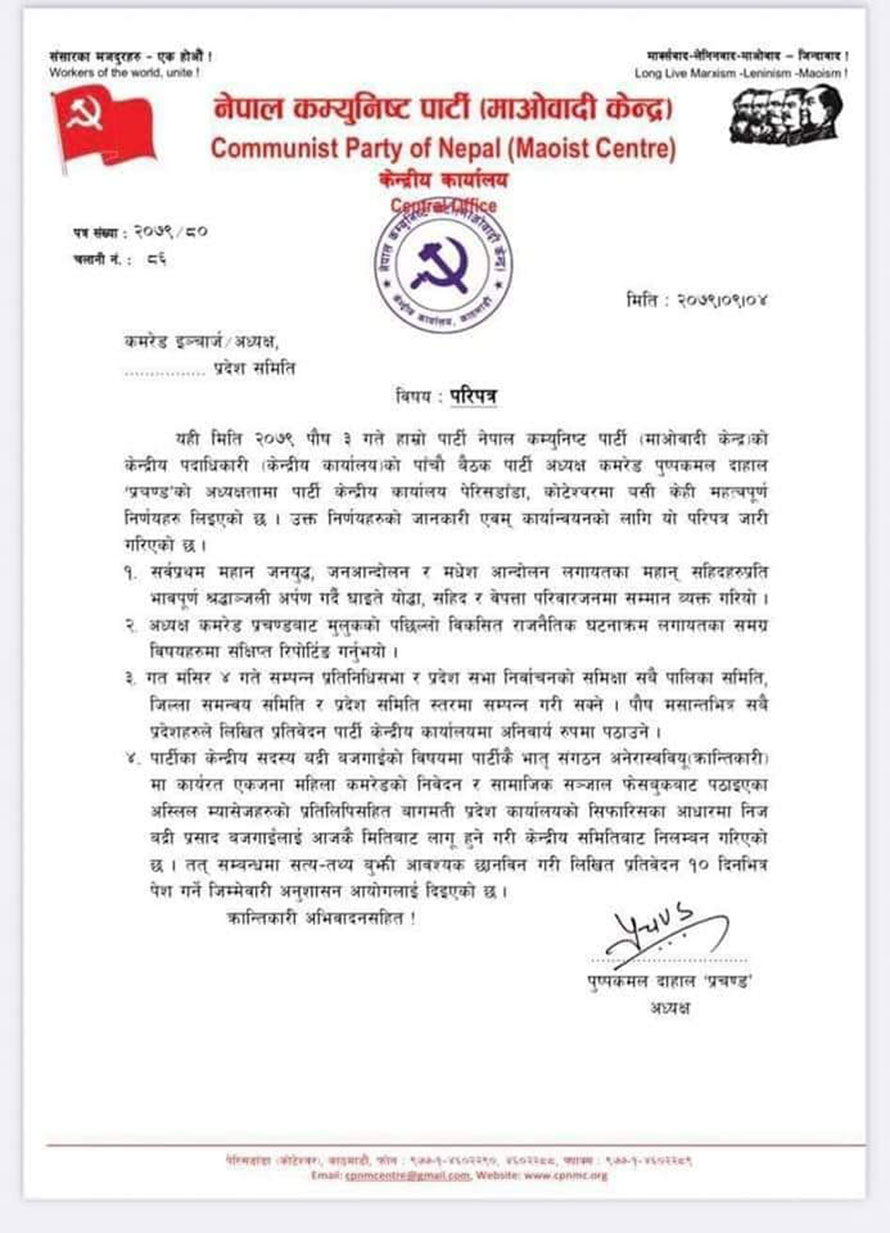 माओवादी केन्द्रको ३ पुसमा बसेको पदाधिकारीको बैठकले उनलाई केन्द्रीय समितिबाट निलम्बन गर्दै छानबिनको जिम्मा केन्द्रीय अनुशासन आयोगलाई दिएको छ ।