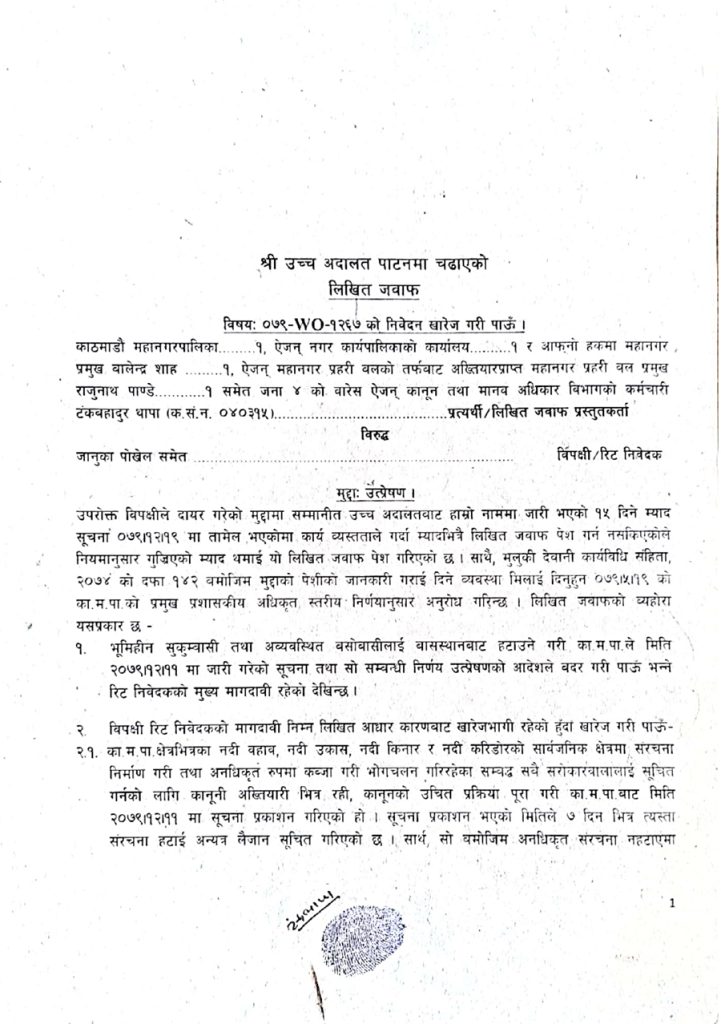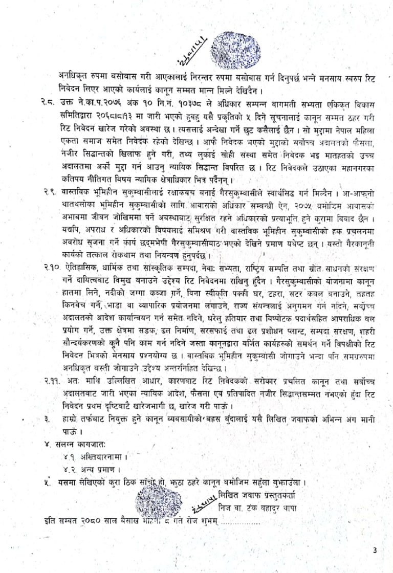 ‘गैरसुकुम्बासीको योजनामा कानुन हातमा लिने, नदीको जग्गा कब्जा गर्ने, विना स्वीकृति पक्की घर, टहरा, सटर कबल बनाउने, तहतह किनबेच गर्ने, भाडा वा व्यापारीक प्रयोजनमा लगाउने, राज्य संयन्त्रलाई अनुगमन गर्न नदिने, सर्वोच्च अदालतको आदेश कार्यान्वयन गर्न समेत नदिने, घरेलु हतियार तथा विस्फोटक पदार्थसहित आपराधिक बल प्रयोग गर्ने, उक्त क्षेत्रमा सडक, ढल निर्माण, सरसफाइ तथा ढल प्रशोधन प्लान्ट, सम्पदा संरक्षण, शहरी सौन्दर्यीकरणको कुनै पनि काम गर्न नदिने जस्ता कानुनद्वारा बर्जित कार्यहरूको समर्थन गर्ने विपक्षीको रिट निवेदन भित्रको मनसाय प्रश्नयोग्य छ’ लिखित जवाफमा भनिएको छ ।