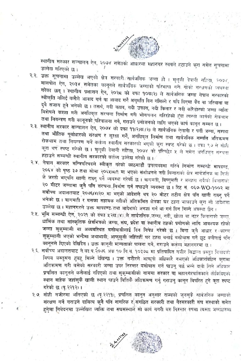 महानगरविरूद्ध परेको रिटको सुनुवाइ गर्दै अदालतले १७ चैतमा सुकुम्बासीवस्ती तत्काल नहटाउन अल्पकालीन अन्तरिम आदेश दिएको थियो । महानगरले ११ चैतमा एक सूचना निकालेर नदी किनार, नदी उकास तथा नदी बहाव क्षेत्रमा बनेका अनधिकृत संरचना सात दिनभित्र हटाउन आग्रह गरेपछि महानगरविरुद्ध रिट परेको थियो ।
