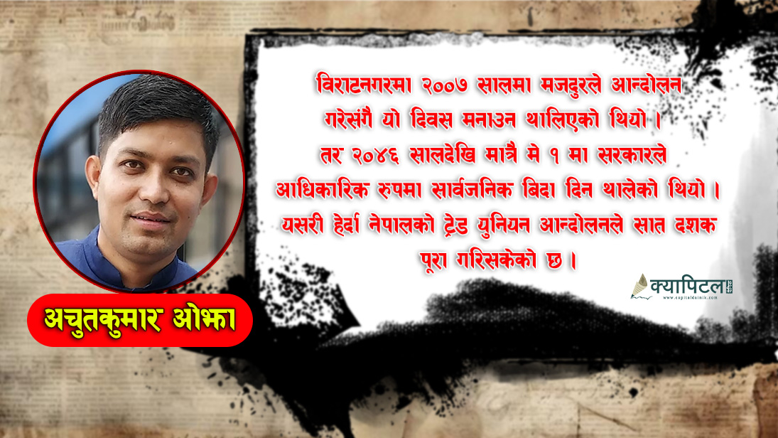नेपालमा २००३ फागुन २० गते विराटनगर जुटमिलमा गिरिजाप्रसाद कोइरालाको नेतृत्वमा विराटनगर मजदुर युनियन गठन गरेसँगै औपचारिक रुपमा ट्रेड युनियन आन्दोलन सुरुआत भएको इतिहास रहेको छ । विराटनगरमा २००७ सालमा मजदुरले आन्दोलन गरेसँगै यो दिवस मनाउन थालिएको थियो । तर २०४६ सालदेखि मात्रै मे १ मा सरकारले आधिकारिक रुपमा सार्वजनिक बिदा दिन थालेको थियो । यसरी हेर्दा नेपालको ट्रेड युनियन आन्दोलनले सात दशक पूरा गरिसकेको छ ।