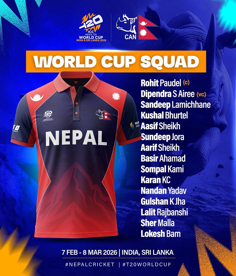 काठमाडौं । आउँदो फेब्रअरी ७ तारिख अर्थात् माघ २४ गतेदेखि फागुन २४ गतेसम्म भारत र श्रीलंकामा हुने आइसीसी पुरुष टी–२० विश्वकपका लागि नेपाली क्रिकेट टोलीको घोषणा भएको छ ।