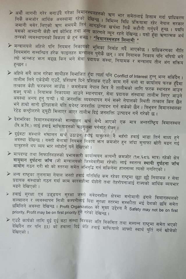 हवाई सुरक्षा एवं उड्डयन सुरक्षा जस्तो संवेदनशील क्षेत्रमा मनोमानी ढंगले विमानस्थलको सञ्चालन र व्यवस्थापन निजी कम्पनीलाई दिँदा सुरक्षा स्तरमा सम्झौता भइ देशकै छवि समेत धमिलिने खतरा बढेको उनले बताए ।