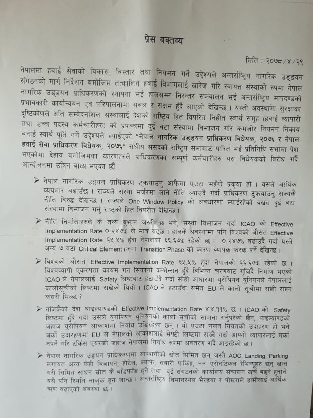 काठमाडौं । सुरक्षाको दृष्टिकोणले अनि संवेदनशील संस्थालाई राष्ट्रिय हित विपरीत निहित स्वार्थ समूह (हवाई व्यापारी तथा उच्च पदस्थ कर्मचारीहरु) को प्रपञ्चमा दुईवटा संस्थामा विभाजन गर्ने गरी ल्याइएको ‘नेपाल नागरिक उड्डयन प्राधिकरण विधेयक, २०७६’ र ‘नेपाल हवाई सेवा प्राधिकरण विधेयक, २०७६’ तत्काल फिर्ता लिन सरकारसँग माग गर्दै प्राधिकरण कर्मचारी आन्दोलित भएका छन् ।