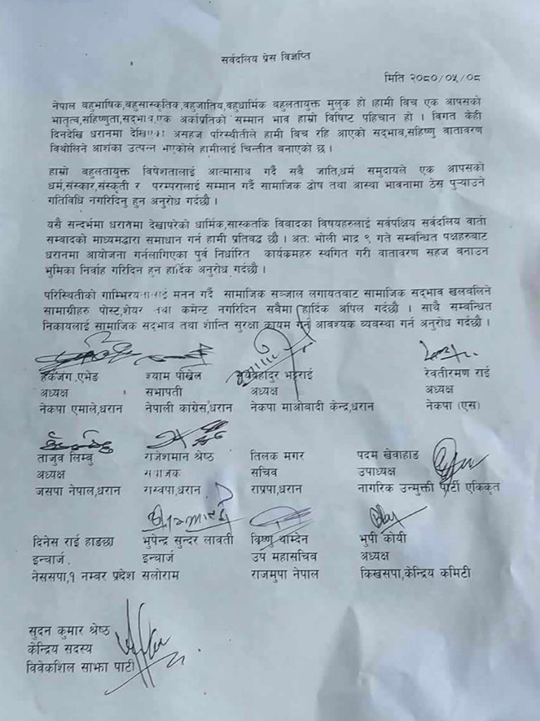 ‘हाम्रो बहुलतायुक्त विशेषतालाई आत्मसाथ गर्दै सबै जाती, धर्म, समुदायले एक आपसको धर्म, संस्कार, संस्कृति र परम्परालाई सम्मान गर्दै सामाजिक द्वेष तथा आस्था भावनामा ठेस पु¥याउने गतिविधि नगरिदिनु हुन अनुरोध गर्दछौँ,’ धरानका १३ राजनीतिक दलले जारी गरेको संयुक्त अपिलमा भनिएको छ ।